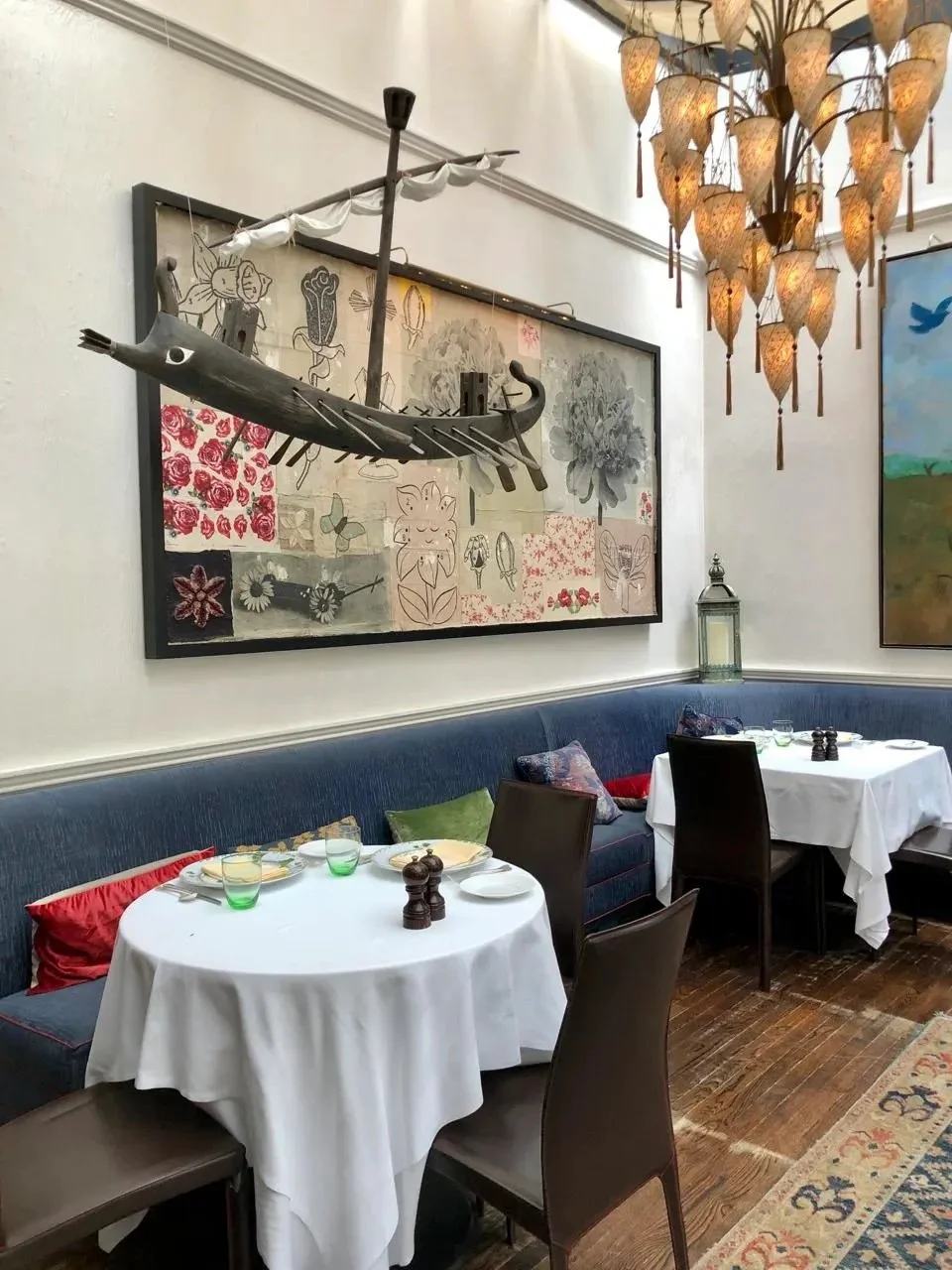 There’s an aquamarine color theme throughout and a museum-worthy collection of art including works by Matisse, Donald Baechler and Frank Stella. “Food is my obsession. Wine is my hobby. Art is my side passion,” says Giuseppe.