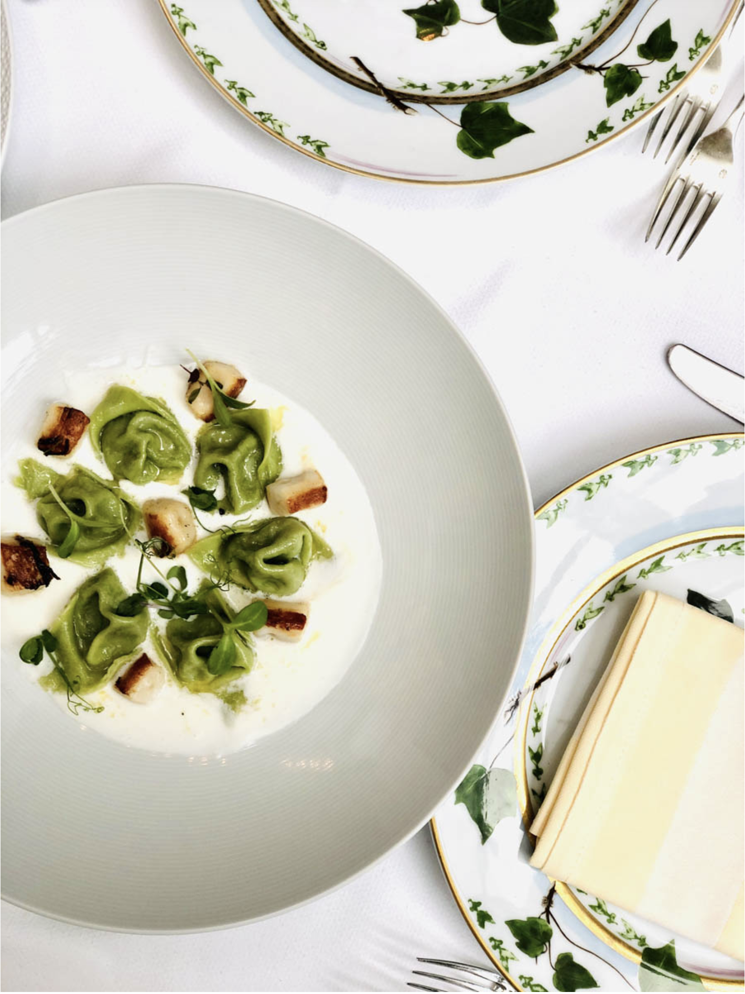 It's no coincidence that scenes from some famous movies and series, starting with The Undoing with Nicole Kidman and Hugh Grant, were filmed in the halls of Sistina. But we don't stop at architecture or paintings and sculptures. The tables at Sistina are also works of art. Sumptuous mise en place, where the various Ginori collections purchased by the chef to amaze his super guests take center stage. Bruno's favorite is the Galli Rossi collection, but it competes with collections like Oro di Doccia, Italian Fruit, Oro Nero, Pesci Leipold, and many others used daily to highlight the gastronomic offerings.